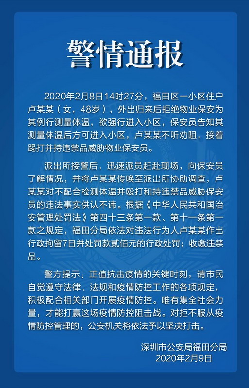 2020年2月8日14時(shí)27分,福田區(qū)一小區(qū)住戶盧某某(女,48歲),外出歸來后拒絕物業(yè)保安為其例行測量體溫,欲強(qiáng)行進(jìn)入小區(qū),保安員告知其測量體溫后方可進(jìn)入小區(qū),盧某某不聽勸阻,接著踢打并持違禁品威脅物業(yè)保安員。