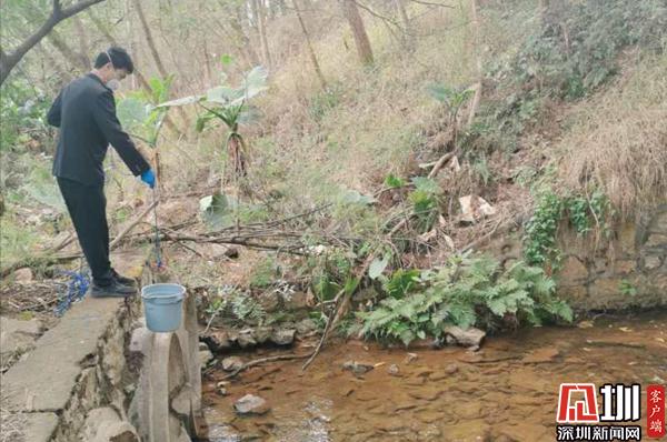 工作人員對飲用水源支流水質(zhì)進行采樣。