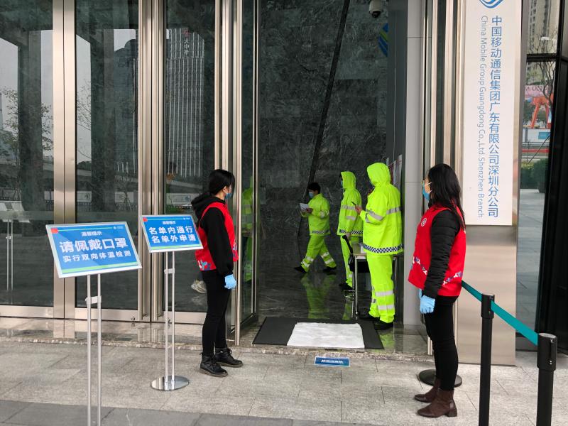中國(guó)移動(dòng)門口實(shí)行雙向體溫監(jiān)測(cè),名單內(nèi)通行,名單外申請(qǐng)。