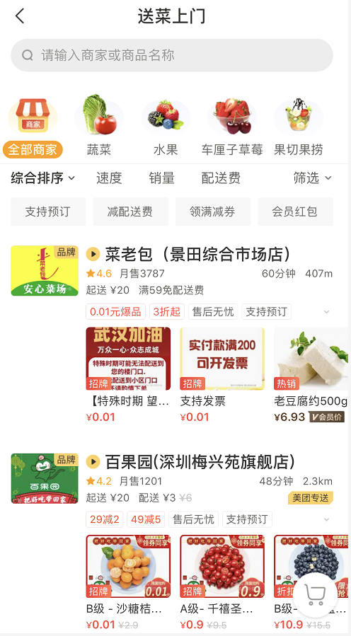 商品情況:店鋪相對(duì)較少,但果蔬肉禽海鮮齊全;另外,部分門(mén)店休息中,可先看看自己所在地區(qū)是否提供配送。