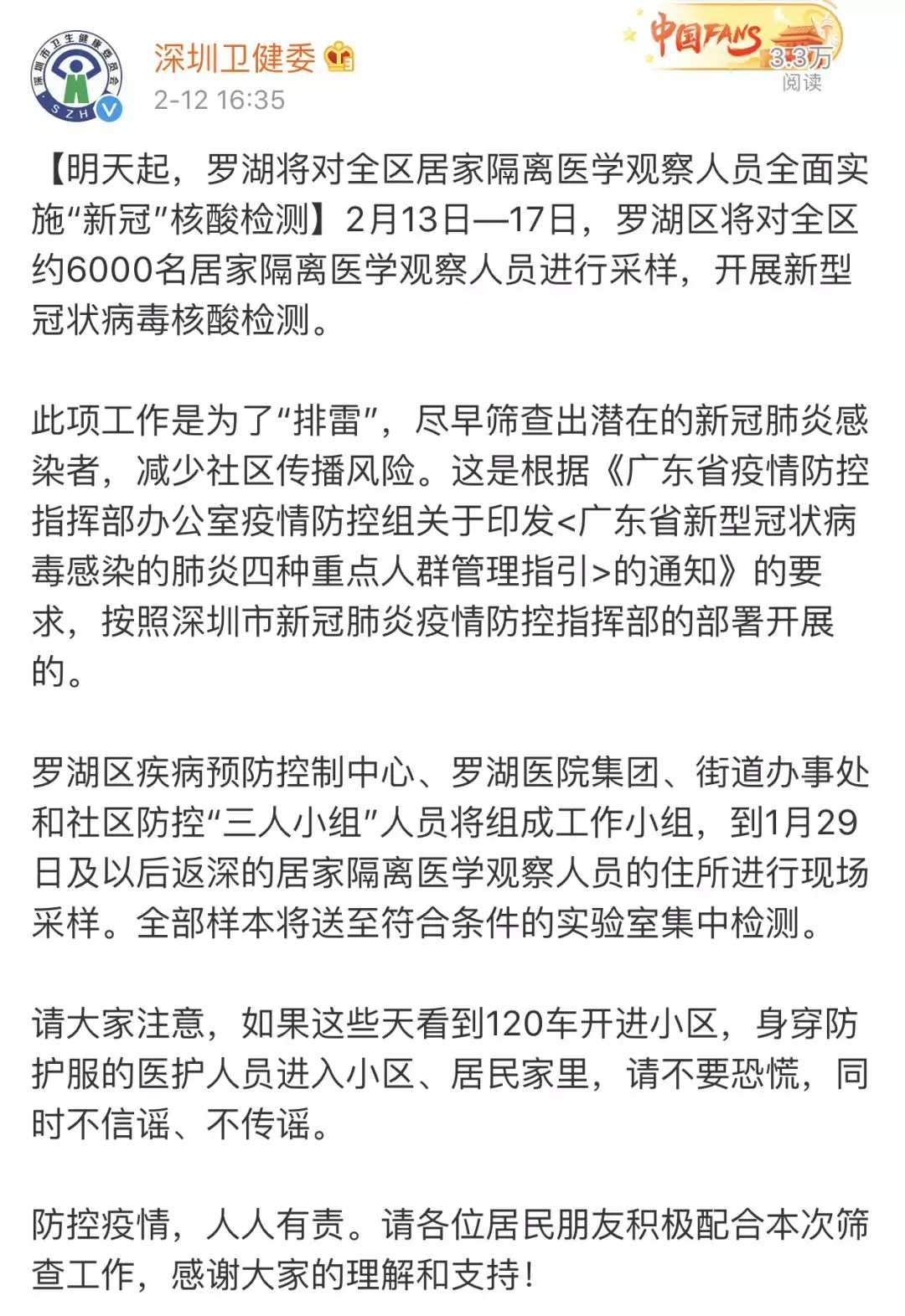 徹底“排雷”!深圳免費(fèi)為所有居家隔離者檢測(cè)“新冠”病毒核酸