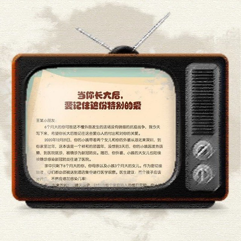 寶安區(qū)新安街道海富社區(qū)一名6個(gè)月大的孩子,因家里有人被確診為新型冠狀病毒感染的肺炎,被迫與家人分開進(jìn)行醫(yī)學(xué)觀察。海富社區(qū)工作人員們對(duì)其悉心照顧,如今孩子已經(jīng)平安度過了14天的居家觀察期。海富社區(qū)特意為孩子留下一封情真意切的書信,希望孩子長(zhǎng)大后,能記住這段特殊時(shí)期收獲的特殊的愛。