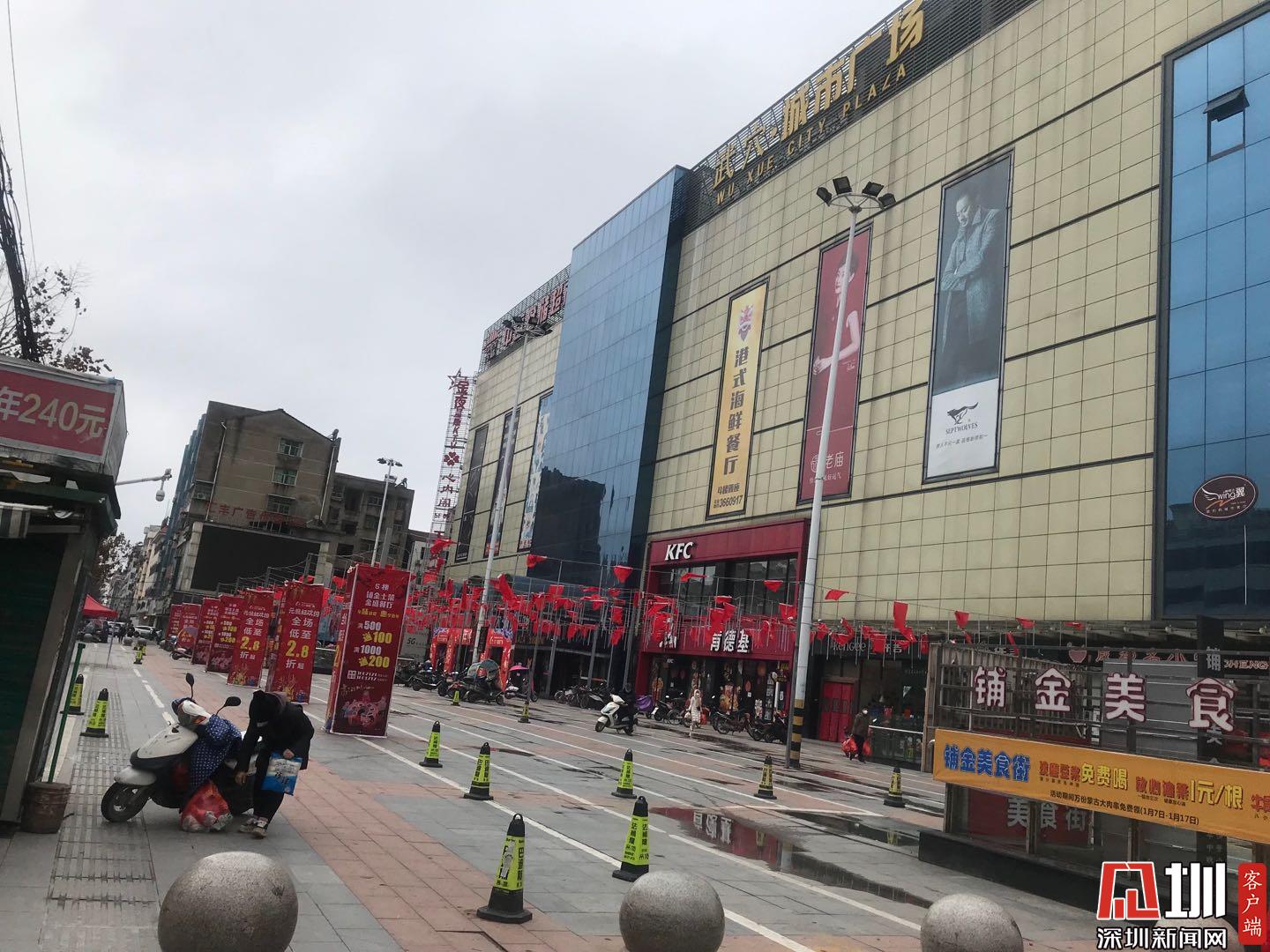 路上,車輛和行人很少,車載廣播循環(huán)在大街小巷播放防疫須知。在武穴老城區(qū)中心的城市廣場,除了中百倉儲超市營業(yè)外,肯德基、屈臣氏等其他店鋪都暫停營業(yè)。