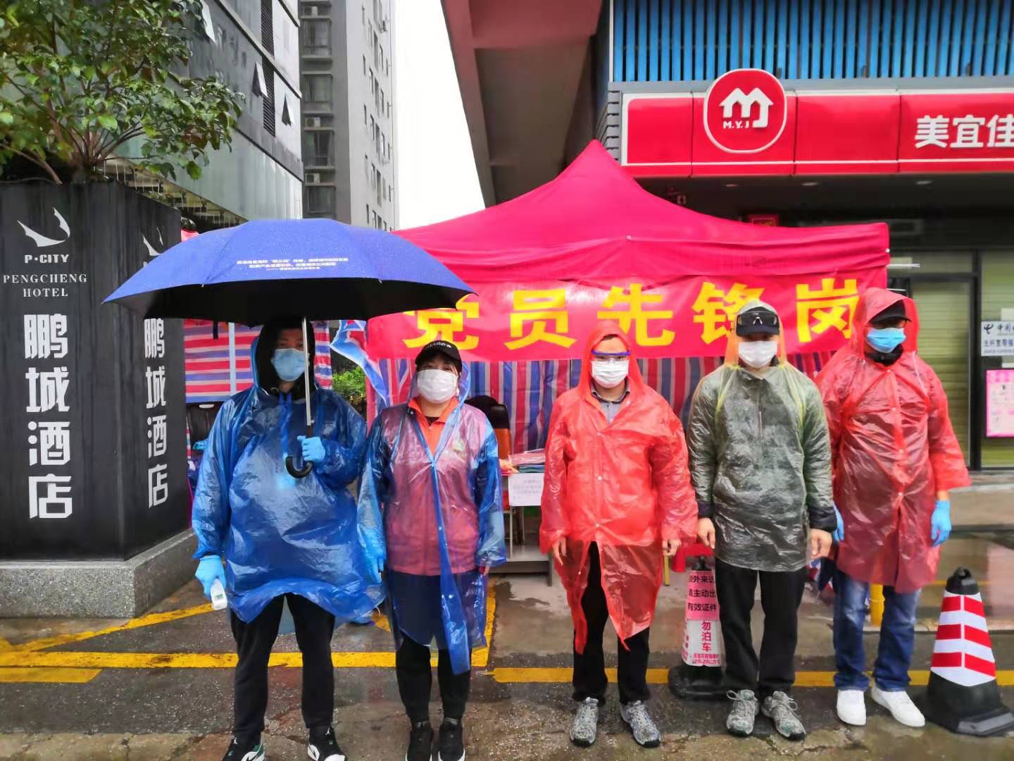 在龍華區(qū)福城街道茜坑社區(qū)的黨員先鋒崗上,工作人員和志愿者只有一襲最簡單的一次性雨衣,卻依然堅守在崗位上。(見圳客戶端、深圳新聞網記者沈婷)