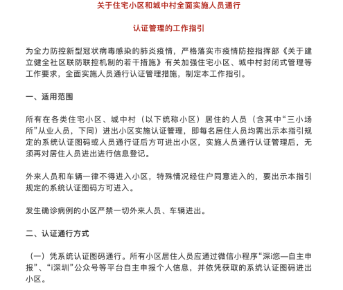 2月9日,深圳發(fā)布《關(guān)于住宅小區(qū)和城中村全面實施人員通行認證管理的工作指引》,文中明確表示所有在各類住宅小區(qū)、城中村居住的人員需通過微信小程序“深i您”、“i深圳”公眾號等平臺自主申報個人信息,并依憑獲取健康碼進出小區(qū),無須再做登記。