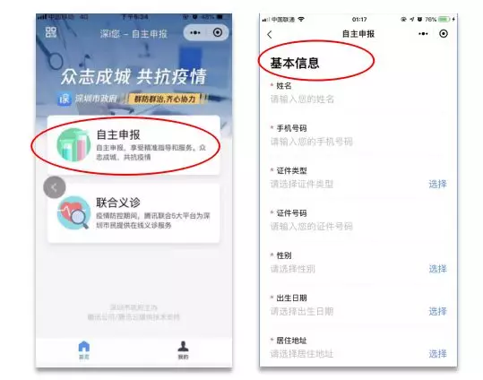 第一步:通過微信搜索“深i您-自主申報(bào)”小程序、i深圳公眾號(hào)-抗擊疫情-深i您自主申報(bào)、“i深圳”APP疫情防控服務(wù)專區(qū)入口等多途徑進(jìn)入自主申報(bào)平臺(tái),請根據(jù)實(shí)際情況填寫基本信息、人員類型、是否居家隔離、居住屬性、是否有如下癥狀、其他等信息,其中帶*號(hào)和有必選字樣的為必填項(xiàng),請按照平臺(tái)提示填寫。