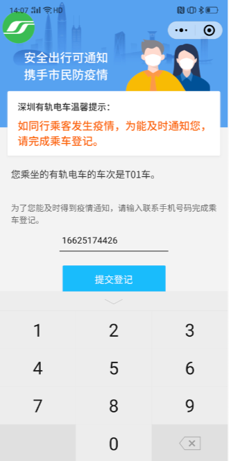 第一步:乘客使用微信掃描列車車廂內(nèi)的登記碼,登記頁面會(huì)自動(dòng)顯示上次登記的手機(jī)號(hào)或在“深圳通+”小程序中注冊的手機(jī)號(hào)碼:
