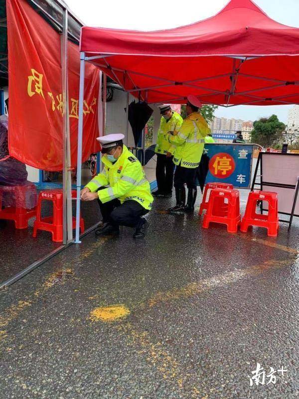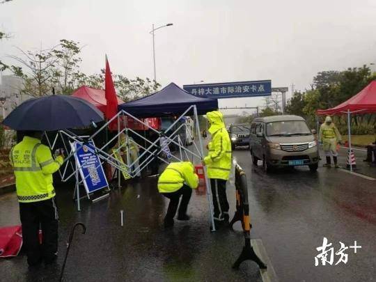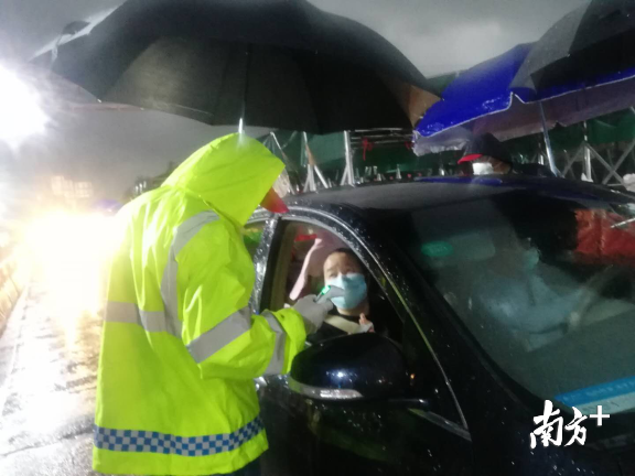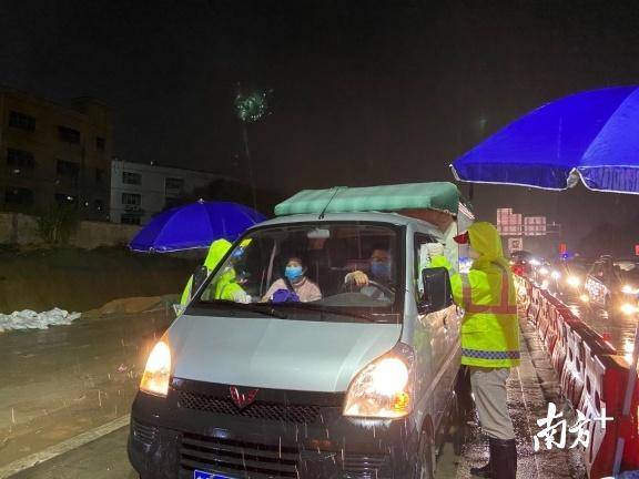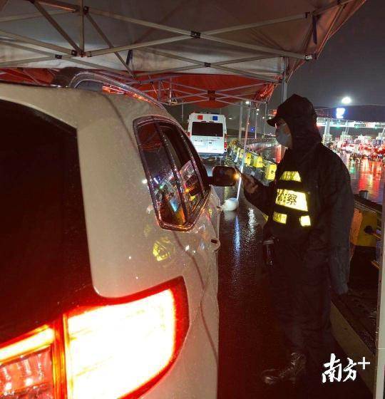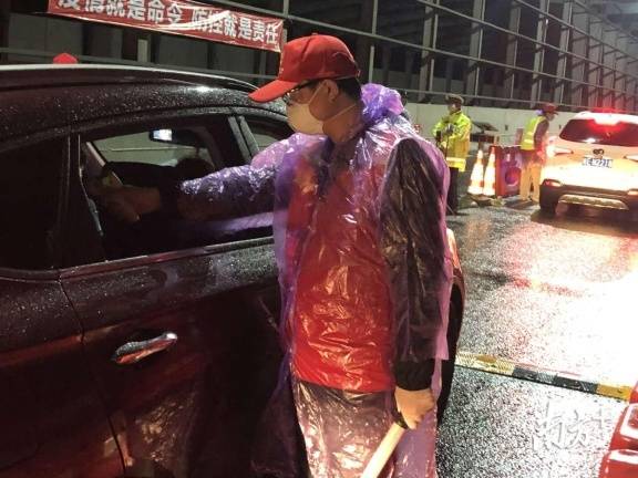 寶安區(qū)羅田檢疫站指揮部總指揮,石巖街道黨工委副書記、人大工委主任鄧亞虎,石巖街道副主任林志明和羅田交通聯(lián)合檢疫站臨時黨支部黨員冒雨檢查。當晚,深圳市公安局經偵支隊支援4名民警在現(xiàn)場冒雨防疫檢查。