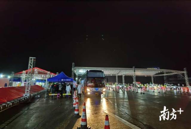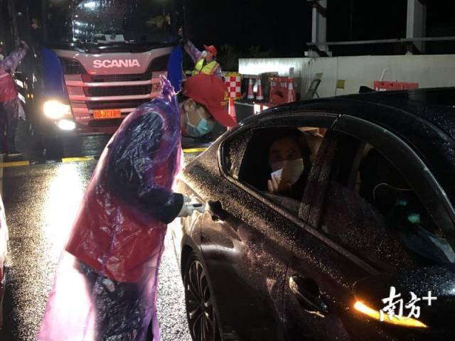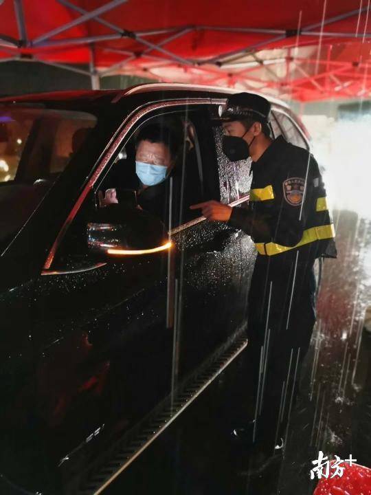 龍城街道黨員干部、工作人員與龍崗區(qū)退役軍人義工隊、龍崗交警組成防控隊伍,借助現(xiàn)場高速雨棚的遮擋,對進深車輛一一進行排查。
