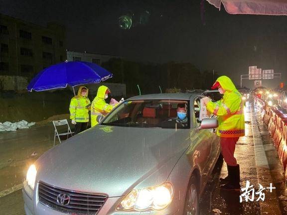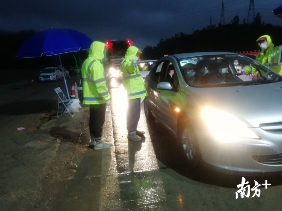“富地崗防疫檢查點地理位置受限,條件相對艱苦。但我們不被困難所嚇到,不被風雨而耽擱我們查驗工作?!逼旱亟值傈h員干部和工作人員在大雨中堅守,就在晚上10:30左右,該卡點攔截2臺粵B牌車輛,來自湖北黃岡籍人員一家5人,居住橫崗街道,坪地街道值班領導立即協(xié)調安排交警、派出所帶車,并成功和橫崗街道對接。