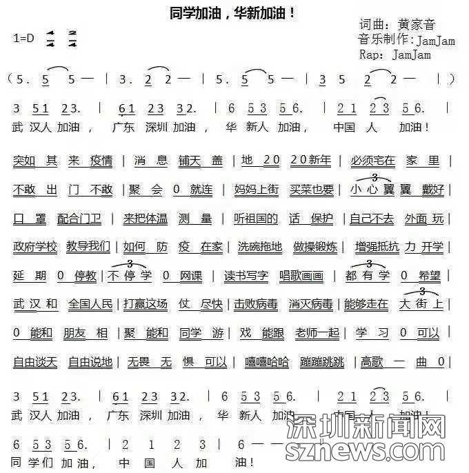 開學(xué)首日,深圳市福田區(qū)華新小學(xué)音樂教師黃家音作詞作曲《同學(xué)加油華新加油》祝福武漢,叮囑同學(xué),而這,作為華新小學(xué)綠色校本課程的一個(gè)縮影,福田區(qū)教科院在線教學(xué)巡查員徐奇志老師在觀看后很是感動(dòng),她評(píng)價(jià)道:一樣的疫情,不一樣的開學(xué)第一課。福田區(qū)教科院音樂教研員楊岳軍老師則認(rèn)為詞曲富有童趣,適合少兒,簡單通俗,易于傳唱。