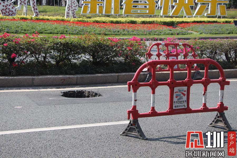 深圳市民廣場(chǎng)前一輔路驚現(xiàn)直徑一米坑 有關(guān)部門(mén):正加緊修復(fù)