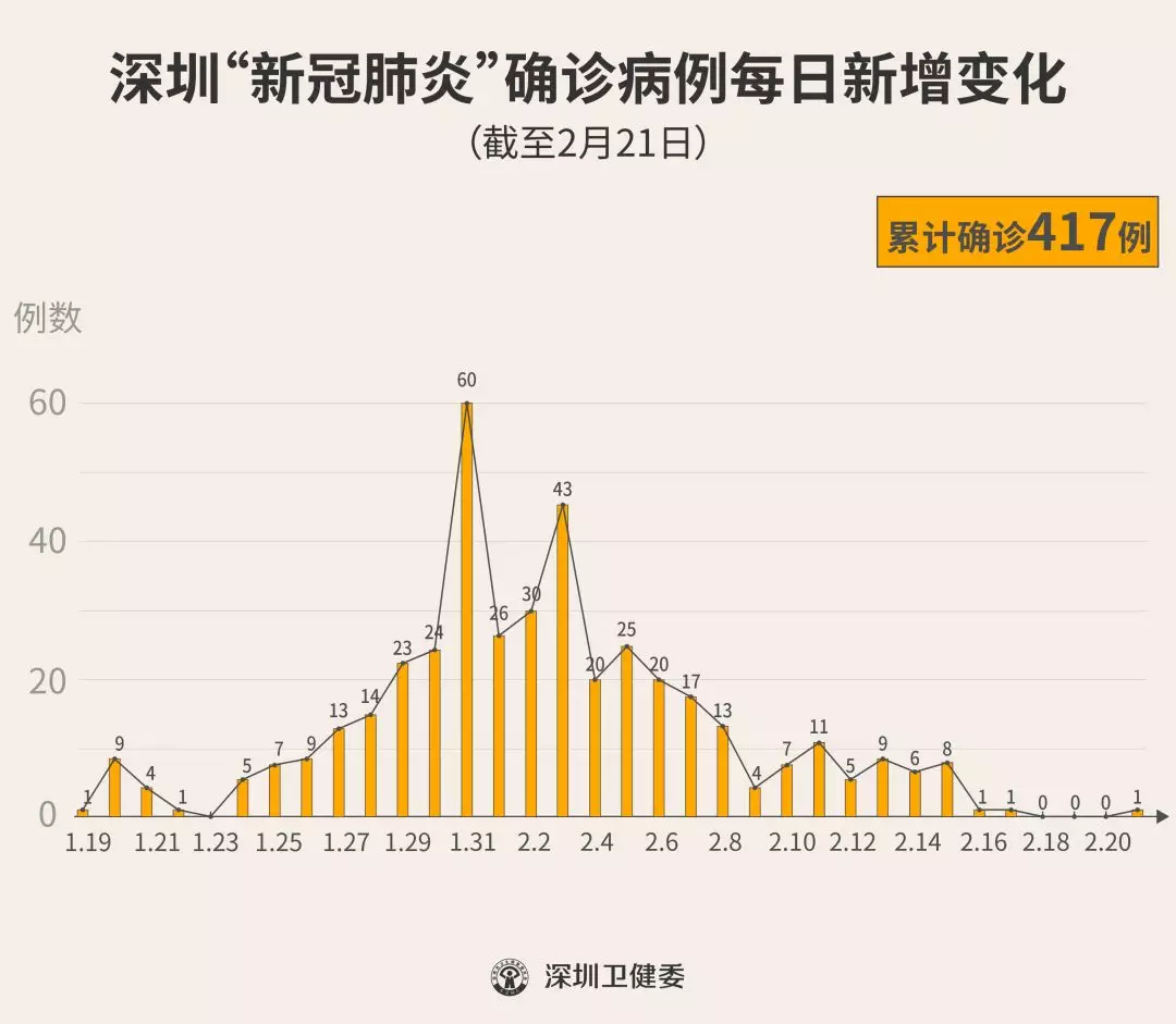 截至2月21日24時(shí),深圳累計(jì)報(bào)告“新冠肺炎”確診病例417例。2月21日當(dāng)天全市新增確診病例1例(個(gè)案詳情今晚公布)。 ▲新增出院病例已超過新增確診病例 累計(jì)報(bào)告確診病例中,男性197例、女性220例。 按照病例管理地區(qū)劃分,南山區(qū)87例、福田區(qū)81例、龍崗區(qū)71例、寶安區(qū)62例、龍華區(qū)34例、羅湖區(qū)32例、光明區(qū)11例、坪山區(qū)7例、鹽田區(qū)6例、大鵬新區(qū)2例、其他(指由機(jī)場(chǎng)、車站、碼頭、關(guān)口、路卡等直接送往定點(diǎn)醫(yī)院的)24例。 目前,重癥10例、危重癥9例,死亡2例,累計(jì)出院222例。 193例確診病例均在深圳市第三人民醫(yī)院隔離治療。 202例密切接觸者正在接受醫(yī)學(xué)觀察。 資料來源:深圳市疾控中心、深圳市衛(wèi)健委、廣東省衛(wèi)健委