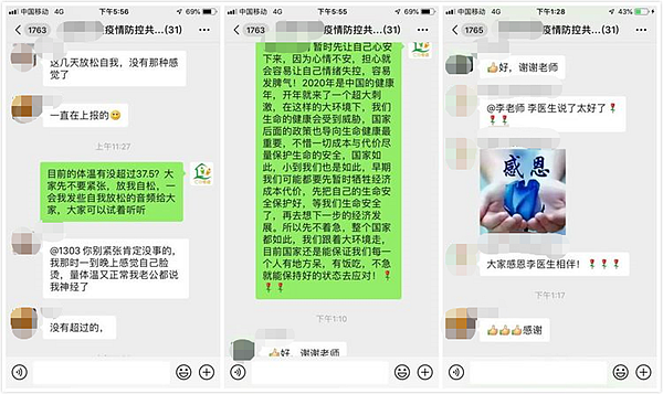 據(jù)介紹,心理服務(wù)小組根據(jù)不同服務(wù)對(duì)象,靈活提供多樣化的可及性心理服務(wù),包括家庭團(tuán)體心理服務(wù)、一對(duì)一個(gè)案咨詢、線上課堂、線上答疑等,具體服務(wù)內(nèi)容有:為確診冠狀病毒感染的病人及家屬提供線上一對(duì)一心理咨詢及家庭團(tuán)體心理服務(wù);關(guān)注社區(qū)一線的工作人員,為“三位一體”工作群、網(wǎng)格員工作群、醫(yī)護(hù)人員工作群、黨群干部工作群等一線工作人員提供“安心防疫心理手冊”線上課堂,視頻講解“安心”防疫工作;為工作強(qiáng)度大、情緒壓力大的一線人員開展線上減壓團(tuán)體活動(dòng)及個(gè)體咨詢服務(wù);在專業(yè)的精神衛(wèi)生專家的指導(dǎo)下,聯(lián)合各社區(qū)的精訪社工,為社區(qū)有精神疾病的病人及家屬提供線上心理復(fù)康指導(dǎo)及心理咨詢服務(wù);開通三條心理服務(wù)熱線,為居家隔離的人群提供線上電話咨詢服務(wù)及微信群線上答疑及文字咨詢活動(dòng)。