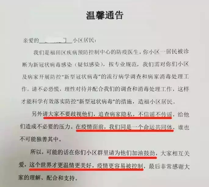 “疫情面前,我們同是一個(gè)命運(yùn)共同體”“大家相互關(guān)愛,這個(gè)世界才更溫情美好,疫情更容易被控制……”1月30日,位于深圳福田區(qū)的一小區(qū)出現(xiàn)新冠肺炎疑似感染病例,福田區(qū)疾病預(yù)防控制中心的防疫醫(yī)生隨即發(fā)布了這則通告,瞬間刷屏了深圳人的朋友圈。通告除了呼吁小區(qū)居民配合調(diào)查及消毒處理工作外,還特地懇請(qǐng)大家“不要歧視,在疫情面前,我們是同一個(gè)命運(yùn)共同體,誰也不可能獨(dú)善其身?!绷攘葦?shù)字的“請(qǐng)求”,感動(dòng)無數(shù)人。