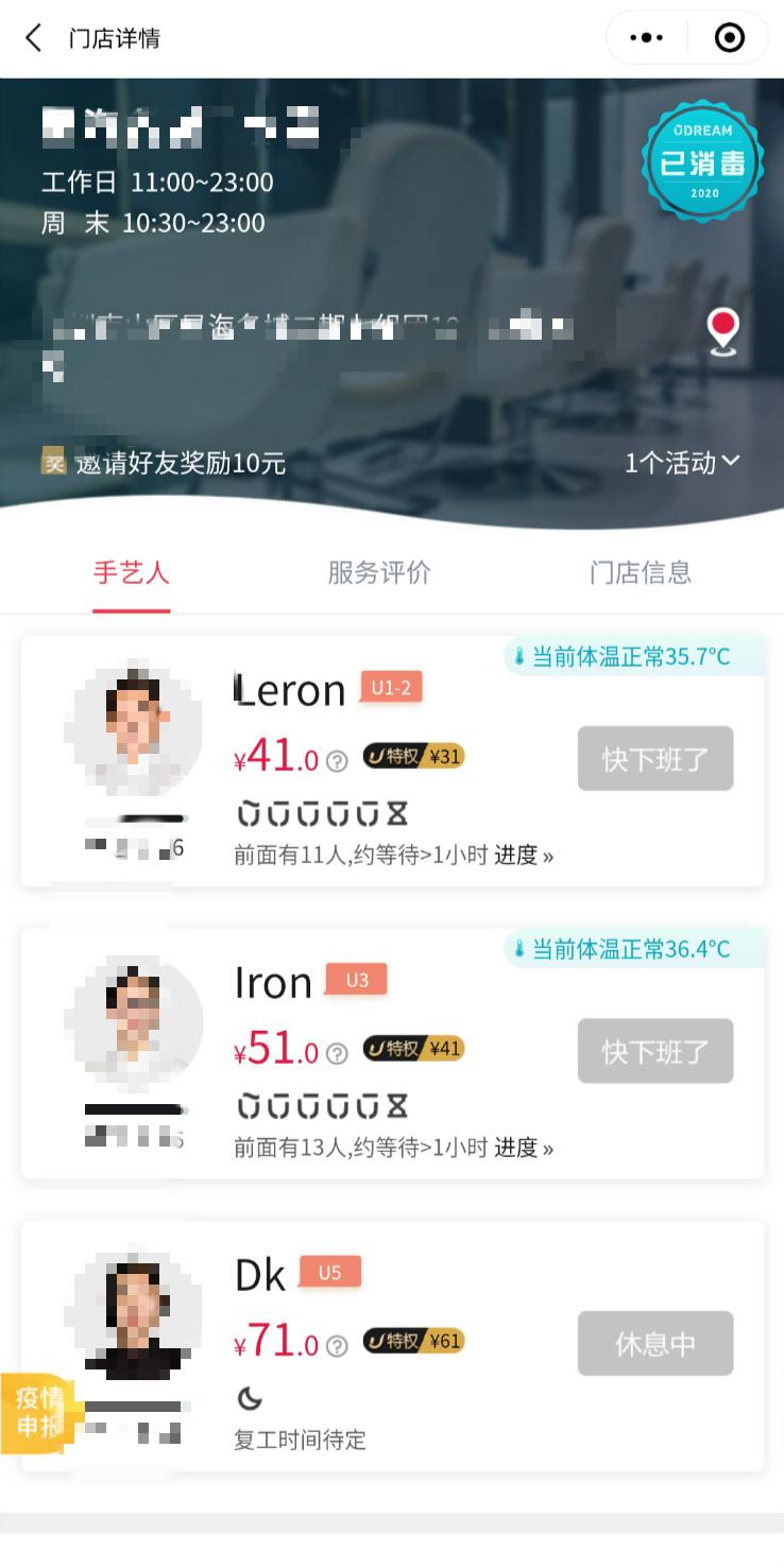 ▲通過線上平臺,顧客可以清晰了解門店消毒情況及理發(fā)師個人體溫。