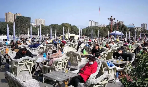 ▲2月21日,四川廣元不少人出門曬太陽。在利州廣場(chǎng),市民扎堆喝壩壩茶,一市民拍視頻稱現(xiàn)場(chǎng)人山人海。