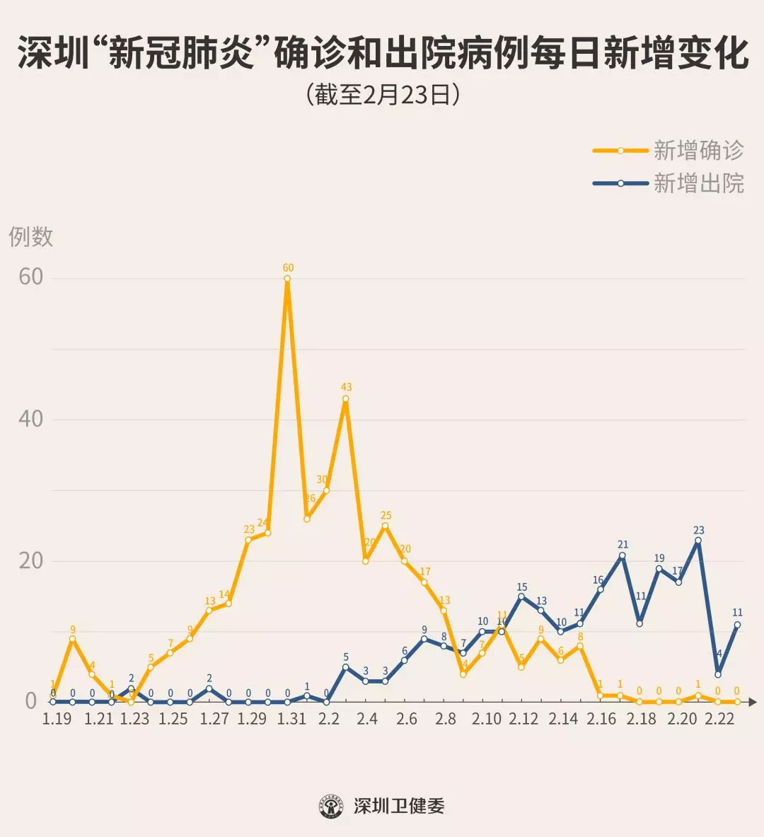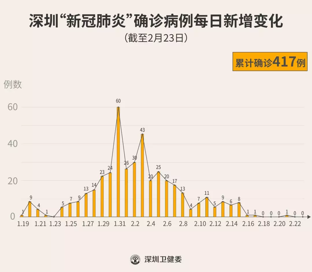 截至2月23日24時,深圳累計報告“新冠肺炎”確診病例417例。2月23日當天全市無新增確診病例。 ▲新增出院病例已超過新增確診病例 累計報告確診病例中,男性197例、女性220例。 按照病例管理地區(qū)劃分,南山區(qū)87例、福田區(qū)81例、龍崗區(qū)71例、寶安區(qū)62例、龍華區(qū)34例、羅湖區(qū)32例、光明區(qū)11例、坪山區(qū)7例、鹽田區(qū)6例、大鵬新區(qū)2例、其他(指由機場、車站、碼頭、關口、路卡等直接送往定點醫(yī)院的)24例。 目前,重癥5例、危重癥8例,死亡3例,累計出院237例。 177例確診病例均在深圳市第三人民醫(yī)院隔離治療。 159例密切接觸者正在接受醫(yī)學觀察。 資料來源:深圳市疾控中心、深圳市衛(wèi)健委、廣東省衛(wèi)健委