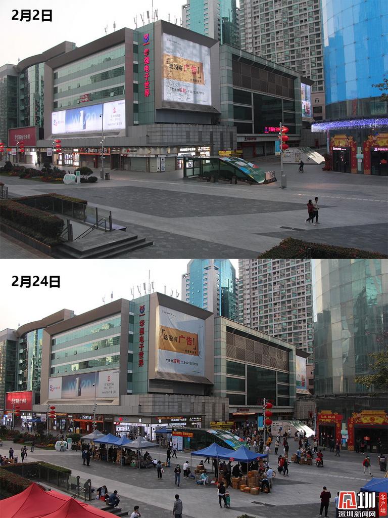 上圖為2月2日,人跡罕見的華強(qiáng)北電子商業(yè)街,下圖為2月24日,華強(qiáng)北電子商業(yè)街人流量已有明顯增多。