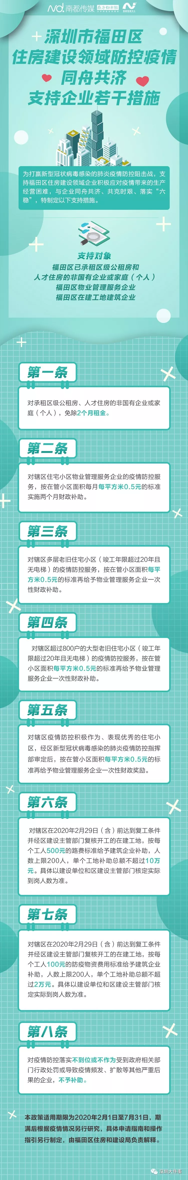 自深圳發(fā)布16條措施支持企業(yè)后,2月18日,福田區(qū)住房和建設(shè)局印發(fā)《深圳市福田區(qū)住房建設(shè)領(lǐng)域防控疫情同舟共濟支持企業(yè)若干措施》(下稱《福田住建支持企業(yè)措施》)的通知,推出8條支持措施,以支持福田區(qū)住房建設(shè)領(lǐng)域企業(yè)積極應(yīng)對疫情帶來的生產(chǎn)經(jīng)營困難。
