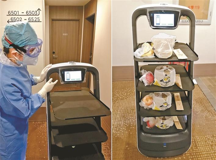 左圖是醫(yī)護(hù)人員在深圳市福田區(qū)華富街道健康驛站介紹送餐機(jī)器人;右圖是依次擺好在機(jī)器人托盤上的食物(2月7日攝)。新華社發(fā)
