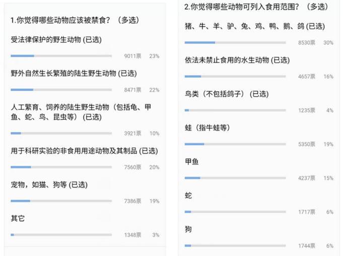 網(wǎng)友投出9011票,贊成“受法律保護的野生動物”應該被禁食,占比23%;另有8471票,22%的網(wǎng)友支持禁食“野外自然生長繁殖的陸生野生動物”。對于“用于科研實驗的非食用用途動物及其制品”選項,有20%的網(wǎng)友(7560票)支持禁食。禁食的投票選項中,還有19%的網(wǎng)友贊成禁食貓狗等寵物(7386票),10%的網(wǎng)友贊成禁食包括龜、甲魚、蛇、鳥、昆蟲等人工繁育、飼養(yǎng)的陸生野生動物,票數(shù)為3921票。