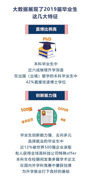 從本科畢業(yè)生升學(xué)情況來(lái)看,有超六成同學(xué)選擇了境外留學(xué),其中四成為直博。在2019屆畢業(yè)生里,直博人數(shù)為144人,占全體畢業(yè)生近20%。