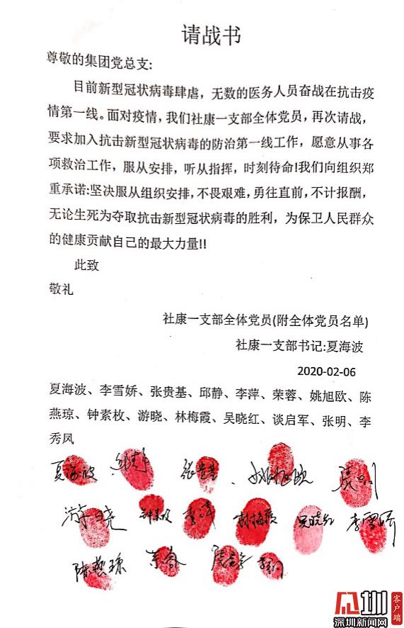 見圳客戶端·深圳新聞網(wǎng)訊(記者 董非)“讓黨旗在防控斗爭第一線高高飄揚。”新冠肺炎疫情發(fā)生以來,南山區(qū)醫(yī)療集團總部黨員勇當(dāng)先鋒,以實際行動踐行初心使命,涌現(xiàn)出眾多感人故事,展現(xiàn)了共產(chǎn)黨員的風(fēng)采與擔(dān)當(dāng)。 疫情發(fā)生后,南山區(qū)第一時間制定出臺了《黨建引領(lǐng)疫情防控工作五項行動方案》,南山區(qū)委書記王強號召全體黨員,發(fā)揮黨組織的戰(zhàn)斗堡壘作用和黨員的先鋒模范作用,全力保障人民群眾生命安全和身體健康,讓黨旗在防控疫情斗爭第一線高高飄揚,堅決打贏疫情防控人民戰(zhàn)爭、總體戰(zhàn)、阻擊戰(zhàn)。南山區(qū)醫(yī)療集團總部積極響應(yīng),黨建引領(lǐng)下的防控抗疫工作有序科學(xué)地展開。 今年1月底,深圳市南山區(qū)區(qū)委授旗成立南山醫(yī)療系統(tǒng)黨員突擊隊。南山區(qū)醫(yī)療集團總部緊急組建了防控新冠肺炎應(yīng)急突擊隊,僅一天內(nèi)區(qū)醫(yī)療集團就共有169人完成第一批應(yīng)急突擊隊報名,其中黨員過半數(shù)。 疾風(fēng)知勁草,烈火煉真金。一封封請戰(zhàn)書閃電匯聚到黨總支,召即來,來能戰(zhàn),戰(zhàn)能勝,沖鋒在前就是擔(dān)當(dāng)?shù)淖蠲姥堇[;一位位黨員迅速入隊黨員突擊隊,他們重溫入黨誓言,在黨旗下實踐著醫(yī)者仁心、人間大愛;一份份入黨申請書紛沓而來,特殊時期經(jīng)受特殊考驗,一批優(yōu)秀的醫(yī)護(hù)人員頁主動向黨組織靠攏。鏗鏘的語言、堅定的決心、舍我的擔(dān)當(dāng),是南山區(qū)醫(yī)療集團總部廣大黨員逆行而上、抗擊疫情的堅定決心和必勝信心。 最美逆行黨支部,積極請戰(zhàn)敢擔(dān)當(dāng) “我是共產(chǎn)黨員,我請戰(zhàn)!愿為戰(zhàn)勝疫情全力以赴!”這是南山區(qū)醫(yī)療集團總部一支部13名黨員和2名入黨積極分子聯(lián)名撰寫的《請戰(zhàn)書》(節(jié)選)。 面對新冠肺炎疫情,一支部黨員在夏海波支部書記夏海波的帶領(lǐng)下,在發(fā)熱門診、發(fā)熱患者預(yù)檢分診、社區(qū)“三位一體”排查等工作中,積極發(fā)揮共產(chǎn)黨員戰(zhàn)斗在一線、沖鋒在一線的模范帶頭作用,為戰(zhàn)勝新冠肺炎疫情全體黨員積極主動請戰(zhàn),并向集團黨總支遞交了請戰(zhàn)書。 社康一支部全體黨員的請戰(zhàn)書 一個個紅手印,令人淚目,彰顯著南山區(qū)醫(yī)療集團總部白衣天使們逆行而上的使命擔(dān)當(dāng)和責(zé)任意識。 一支部書記夏海波說,“成為疫情防控工作第一線發(fā)展黨員,是面對疫情充分發(fā)揮黨員先鋒作用的具體實踐。此次請戰(zhàn),將更加激勵他們我們在今后的工作特別是近期防疫防控工作中,以黨員的標(biāo)準(zhǔn)嚴(yán)格要求自己,發(fā)揮黨員先鋒模范作用。同時,也會對全院全體員工產(chǎn)生積極引領(lǐng)、鼓舞作用,以更飽滿的斗志投入防疫防控工作?!?/p> 老黨員重溫入黨誓詞,面對黨旗表決心 “我宣誓:我志愿加入中國共產(chǎn)黨……”這是一次特別的宣誓。接到組織號召后,社康二支部的老黨員鐘達(dá)宏和吳麗娉,對著黨旗,以重溫入黨誓詞的方式,不忘黨員初心,牢記使命,積極沖鋒在前,誓要打贏防控狙擊戰(zhàn)。 社康二支部的老黨員鐘達(dá)宏和吳麗娉,對著黨旗,重溫入黨誓詞,誓要打贏防控狙擊戰(zhàn) 面對來勢洶洶的疫情,南山區(qū)醫(yī)療集團總部的黨組織和黨員干部不但沒有被嚇倒,反而激起了他們昂揚的戰(zhàn)斗意志和飽滿的工作熱情。 “我宣誓,我自愿加入抗擊新型冠狀病毒肺炎疫情防控工作隊伍,責(zé)任上肩,聽黨指揮,服從命令,科學(xué)應(yīng)對,恪盡職守,努力守護(hù)轄區(qū)居民健康,堅決打贏疫情防控攻堅戰(zhàn)!”守土有責(zé)、守土擔(dān)責(zé)、守土盡責(zé),所有社康中心的黨員干部將筑牢抗疫的基層防線,誓要守護(hù)轄區(qū)居民的生命健康。 社康二支部黨員在黨旗下宣誓努力守護(hù)轄區(qū)居民健康 艱難時刻主動請戰(zhàn),夫妻雙雙奮戰(zhàn)一線 1月26日,南山區(qū)醫(yī)療集團總部下發(fā)關(guān)于組建防控新型冠狀病毒感染肺炎應(yīng)急突擊隊報名的通知。除了得到集團黨員們的積極響應(yīng)之外,各個支部涌現(xiàn)出一波遞交入黨申請書的小高潮。 李婧是社康支部的一名全科醫(yī)生,一直在社康醫(yī)院中心從事全科醫(yī)療工作,戰(zhàn)“疫”的號角吹響,李婧第一時間參戰(zhàn),在所有抗疫時期入黨人員里第一個遞交了手寫入黨申請書。 李婧醫(yī)生的手寫入黨申請書 起初,她所在的蔚藍(lán)海岸社康中心考慮到李婧的愛人是深圳市公立醫(yī)院急診科醫(yī)生其愛人是深圳市某公立醫(yī)院的急診科醫(yī)生,疫情發(fā)生以來一直堅守在崗位上,家中尚有1歲零3個月的寶寶,就沒有讓她參加社區(qū)“三位一體”排查和酒店留守值班等一線工作和醫(yī)學(xué)觀察點留守值班等一線工作。李婧得知后,她主動提交請戰(zhàn)書、舍小家顧大家,并沒有因為生活上的困難而有所退縮,主動要求參與疫情排查一線工作。李婧夫妻還制定了家庭的“交接班”制度,一個去上白班,另一個就上夜班。 執(zhí)行三位一體排查工作前,李婧醫(yī)生與民警、社區(qū)工作者開會準(zhǔn)備 在南山醫(yī)療集團第六黨支部書記蔡偉山給她的入黨介紹信中這