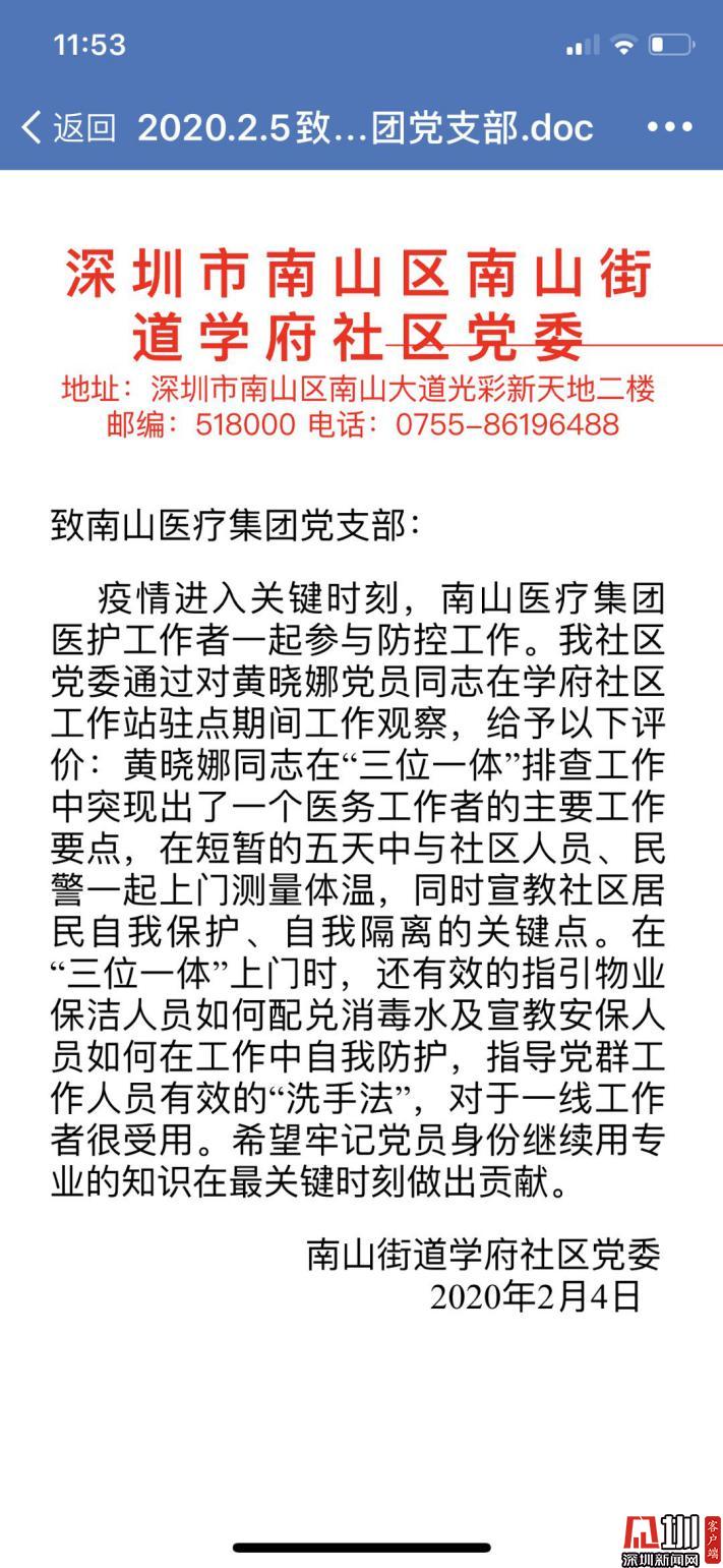 在學府社區(qū)工作站駐點期間,黃曉娜用專業(yè)知識在控制疫情最關(guān)鍵時刻,為社區(qū)居民做出貢獻,并收到了南山區(qū)南山街道學府社區(qū)黨委的感激表揚。