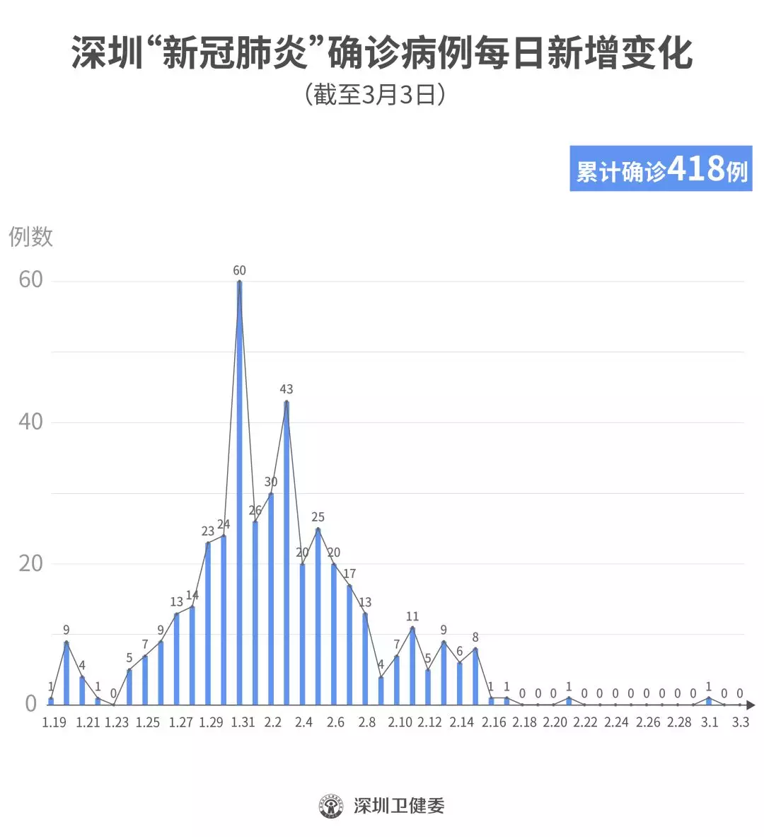 截至3月3日24時(shí),深圳累計(jì)報(bào)告“新冠肺炎”確診病例418例。3月3日當(dāng)天全市無新增確診病例,當(dāng)天出院病例9例(從2月26日起不再公布出院個(gè)案)。