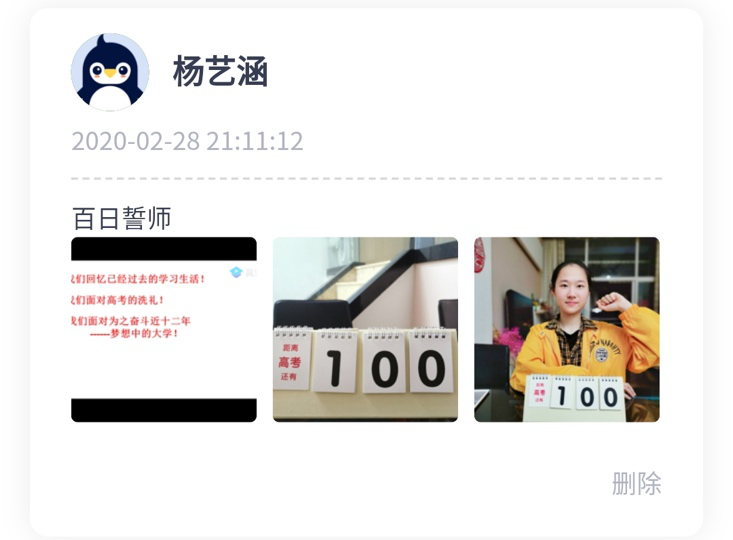 “生于非典,考于新冠,2020,我們注定不凡!疫情當(dāng)前,雖然我們隔離在家,不能像往屆那樣,齊聚學(xué)校體育館舉行誓師大會(huì),意氣風(fēng)發(fā)地走進(jìn)學(xué)校精心準(zhǔn)備的“成功門(mén)”,伴隨奮進(jìn)的樂(lè)聲高喊出我們的誓言,在“簽名紀(jì)念墻”上寫(xiě)下對(duì)未來(lái)的期盼。但即使相隔網(wǎng)絡(luò)兩端,我們依然有老師祝福和引導(dǎo),有家長(zhǎng)的鼓勵(lì)和支持,有同窗的幫助和陪伴,高考百日,我們?nèi)栽谝黄鹫癖鄹吆簦?020高考,我們準(zhǔn)備好了。”