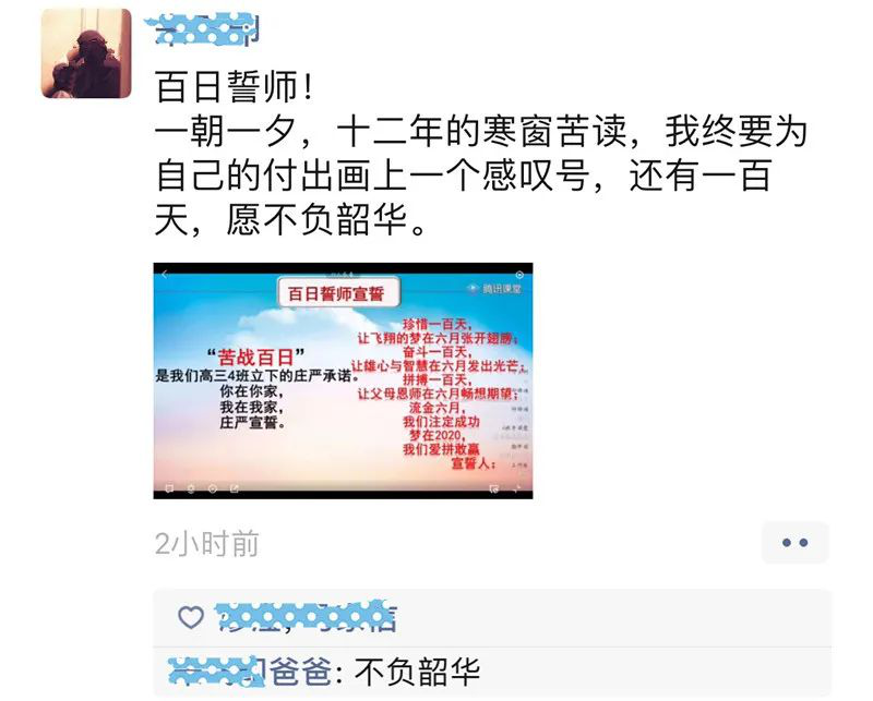 高三(10)班劉欣頤媽媽的留言也贏得了孩子們點(diǎn)贊:“親愛(ài)的孩子們,在這最苦難時(shí)期,請(qǐng)堅(jiān)持你們的奮斗目標(biāo)和理想,不要退縮、勇往直前。許多事情,堅(jiān)持堅(jiān)持就過(guò)來(lái)了。人生就是一場(chǎng)修行,再苦再累,只要朝著自己努力的奮斗目標(biāo),屬于你的終究會(huì)出現(xiàn)。不負(fù)韶華方得始終,夢(mèng)想永遠(yuǎn)屬于努力奮斗的人。加油吧,少年!”