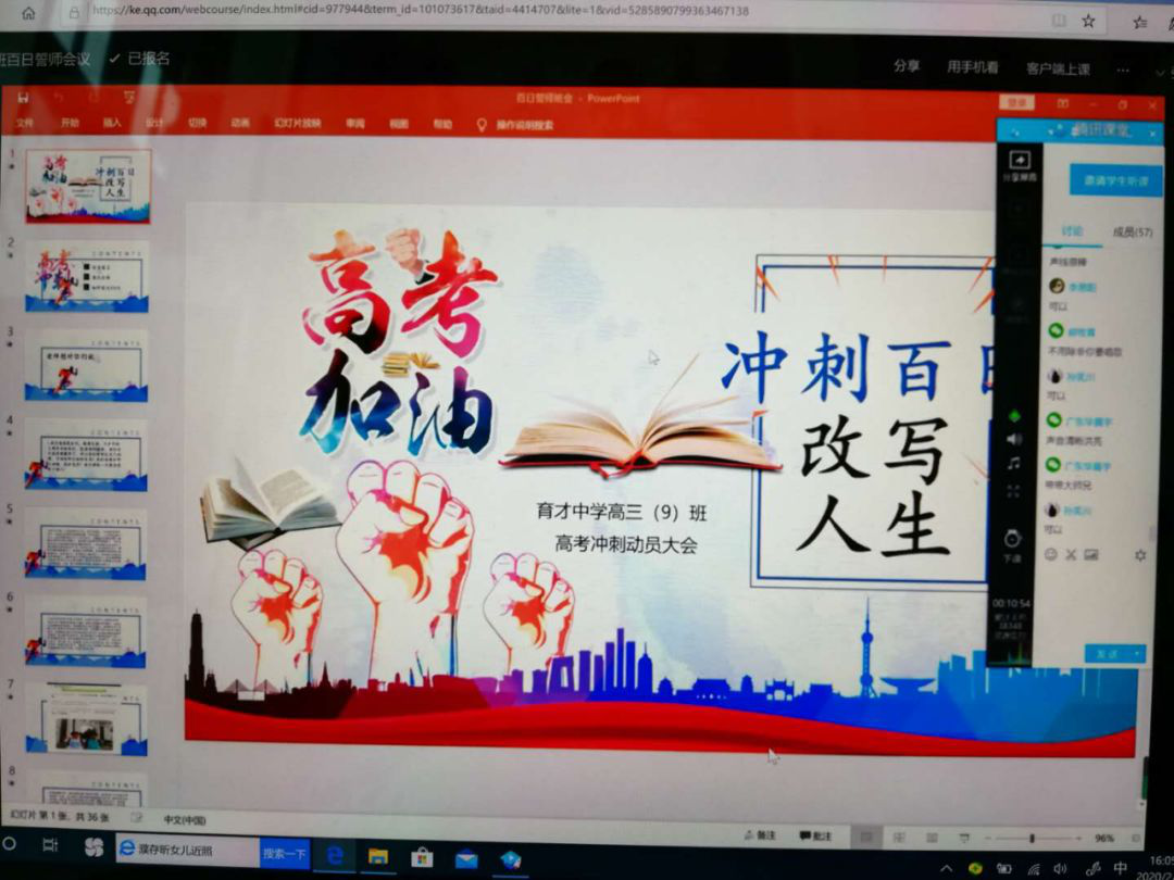 2月28日,橫崗高級(jí)中學(xué)2020屆高三全體師生利用騰訊課堂召開(kāi)以班級(jí)為單位的網(wǎng)上“高考百日誓師大會(huì)”。各班精心制作PPT,提前錄制老師、家長(zhǎng)、同學(xué)的祝福小視頻,科任老師、學(xué)生家長(zhǎng)、學(xué)生代表連麥鼓勵(lì),同學(xué)們最后對(duì)著電子屏幕高喊百日誓詞同時(shí)下定決心,為自己的夢(mèng)想,刻苦拼搏,永不言悔。網(wǎng)上“百日誓師”豪情滿懷、溫情涌動(dòng)、感人至深。