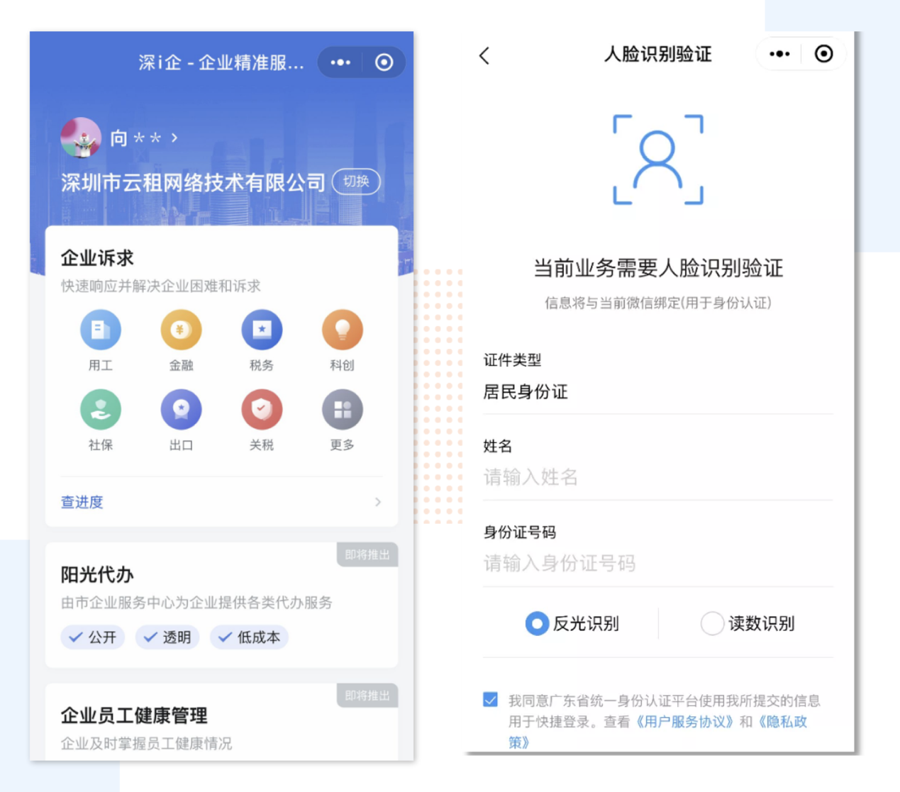 企業(yè)法人或經(jīng)辦人進(jìn)入“深i企-精準(zhǔn)服務(wù)服務(wù)”平臺(tái),選擇登錄,進(jìn)入實(shí)名認(rèn)證環(huán)節(jié)。輸入姓名和證件號(hào)碼后,通過人臉識(shí)別即可完成實(shí)名認(rèn)證。
