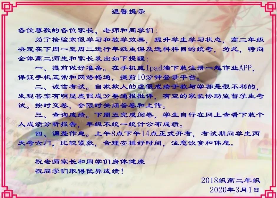 為了提高考試的可信度,考前各班級還進行了誠信教育,讓學生明白誠信考試的重要性以及自欺欺人的危害,并發(fā)動居家的家長積極配合監(jiān)考??记埃瑢W校也向老師學生和家長發(fā)了提示,提醒網上考試注意事項。