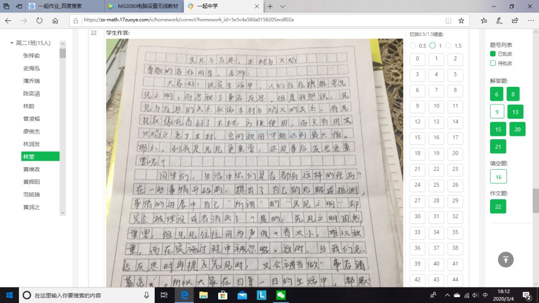 早在網課開始第二周,針對老師們對網課效率不高的顧慮,高二年級就做了一次網上調查,絕大部分老師贊成進行一次網上考試,以檢驗網課的學習效果,以便調整教學。之后,學校開始著手準備網上考試,向技術平臺提交學生和老師信息,下發(fā)《一起作業(yè)學生注冊登錄指引》和《一起作業(yè)教師作業(yè)批改操作指南》。年級各備課組開始命題,為了檢驗二實“線上學堂”的實效,學校要求命題的范圍以直播課內容為主,兼顧寒假作業(yè)??记耙恢埽鱾湔n組都上交平臺進行試卷制作。2月26日,網上作業(yè)批改功能正式上線,高二年級要求備課組在考試之前至少利用線上平臺布置批改一次網上作業(yè),積累經驗,提醒平臺改進不完善的問題,及時更新,同時讓學生和老師熟悉操作技巧。備課組在考前都向學生發(fā)布了考試注意事項,要求學生豎拍照片,注意字跡大小和拍照清晰度,單題上傳,試卷在閱讀頁面和題目設置也做了優(yōu)化,大大方便了學生答題,有效減輕老師改卷負擔,提高了閱卷的效率。