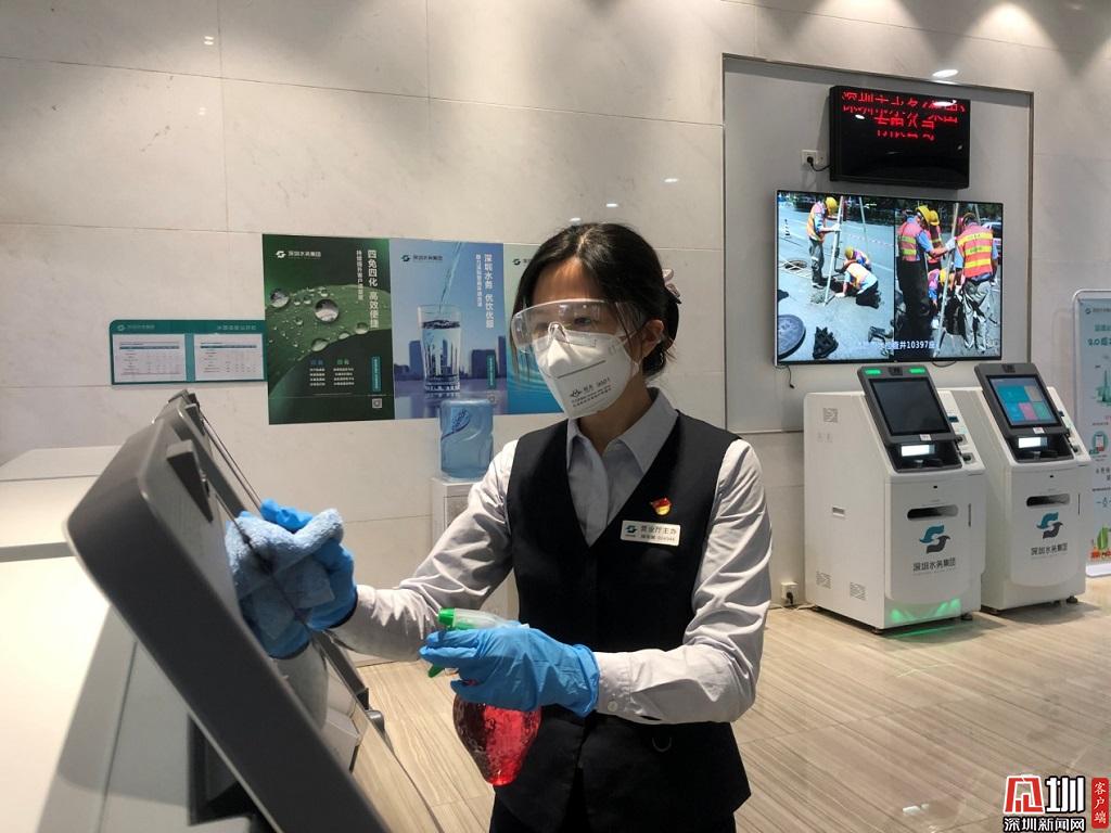 為客戶提供安全、優(yōu)質(zhì)的服務(wù),是深水人的不懈追求。福田分公司福田營(yíng)業(yè)廳楊麗娜,正對(duì)自動(dòng)服務(wù)機(jī)進(jìn)行消毒。