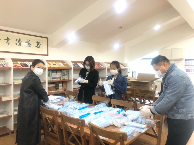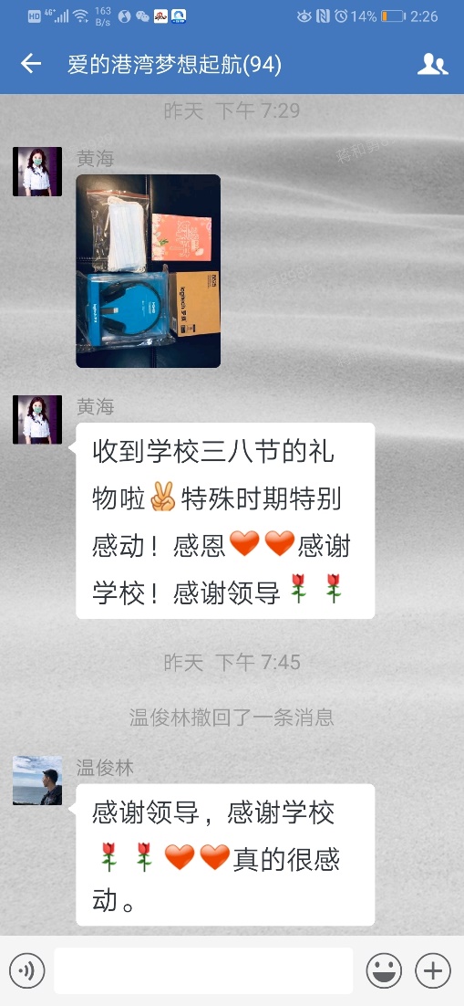 這一次,節(jié)日,校工會一致建議為繼續(xù)做好后續(xù)的“空中教學(xué)”,讓老師確保健康,為他們一并寄上一套口罩。疫情面前,口罩遮住了他們的面龐,卻遮不住眼中溫暖的笑意;手套隔離了病毒的威脅,卻不會將心靈間傳遞的溫情隔斷。