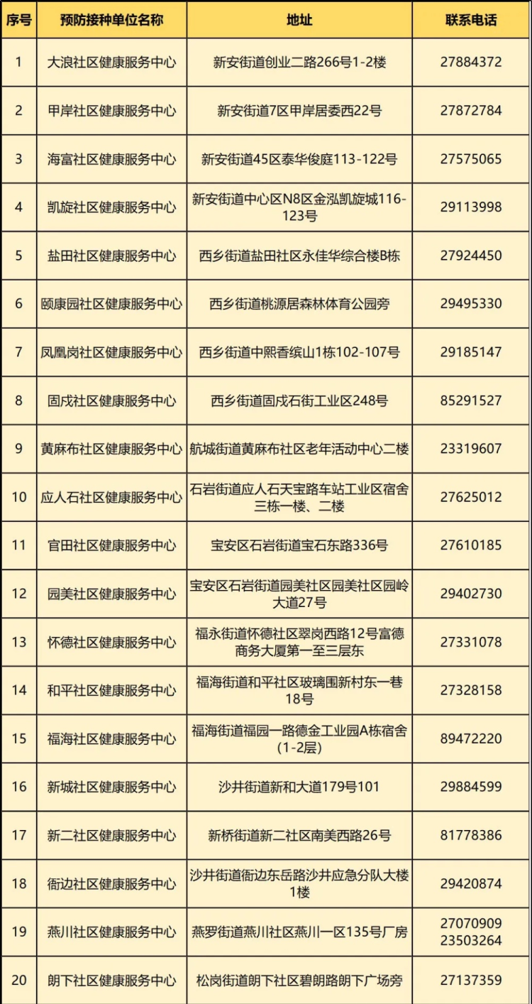 △寶安區(qū)提供預防接種服務的20家社區(qū)健康服務中心名單。