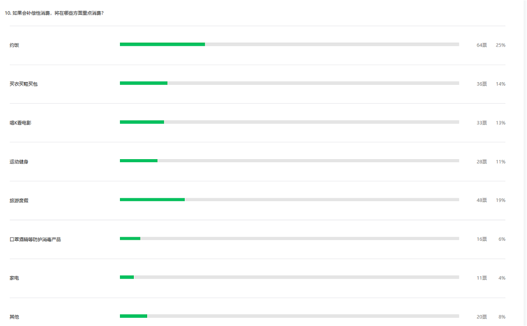 整體看,疫情對(duì)深圳市民總體消費(fèi)意愿有影響。調(diào)查顯示,近四成受訪(fǎng)者表示疫情結(jié)束后會(huì)有補(bǔ)償性消費(fèi),約飯、旅游度假、買(mǎi)衣買(mǎi)鞋買(mǎi)包、唱K看電影以及運(yùn)動(dòng)健身成為疫情過(guò)后補(bǔ)償性消費(fèi)的五大主要領(lǐng)域。