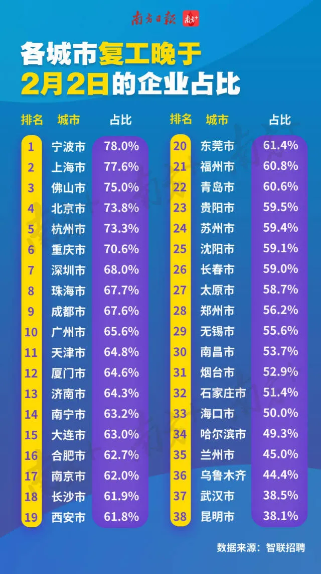 同樣根據(jù)這份《報告》,全國各城市晚于2月2日復工的企業(yè)占比統(tǒng)計排名顯示,前10名中9個城市均為南方城市,寧波企業(yè)延遲復工響應度最高,確定2月2日后復工的企業(yè)占比達到了78%。前10名中4個為廣東城市,分別是佛山、深圳、珠海、廣州。