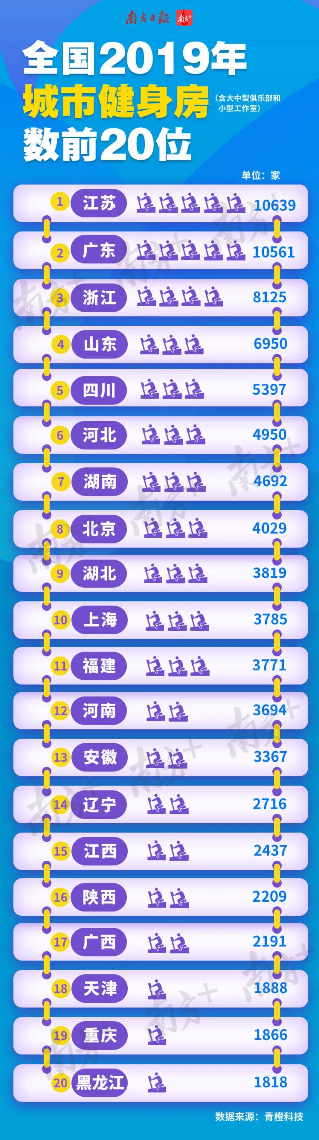 其中江蘇10639家位列第一,廣東10561家排名第二。這個數(shù)據(jù)充分說明廣東在體育健身領域走在前列。