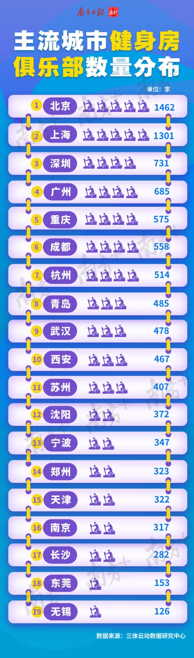 南方經(jīng)濟智庫梳理三體云動數(shù)據(jù)研究中心《2018中國健身行業(yè)數(shù)據(jù)報告》的數(shù)據(jù)發(fā)現(xiàn),北上廣深城市健身房數(shù)量領跑全國,深圳、廣州分列第三和第四。前19名均為經(jīng)濟發(fā)達城市或主要省會城市。