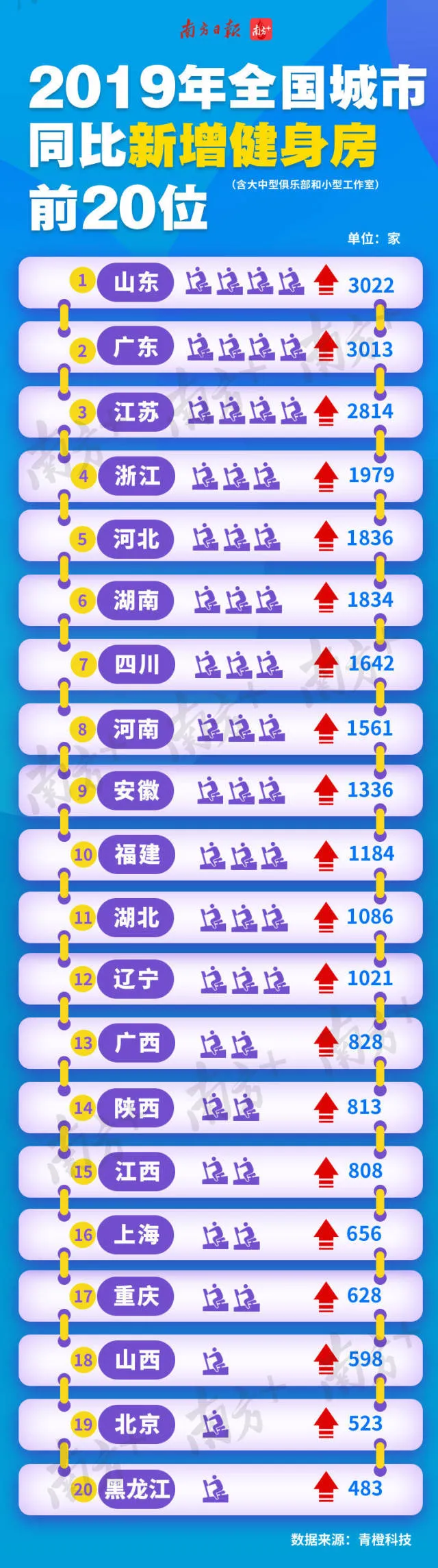 2019年同比增長了3013間健身房。增長數(shù)量位居全國第二,同期僅關閉127家健身房。