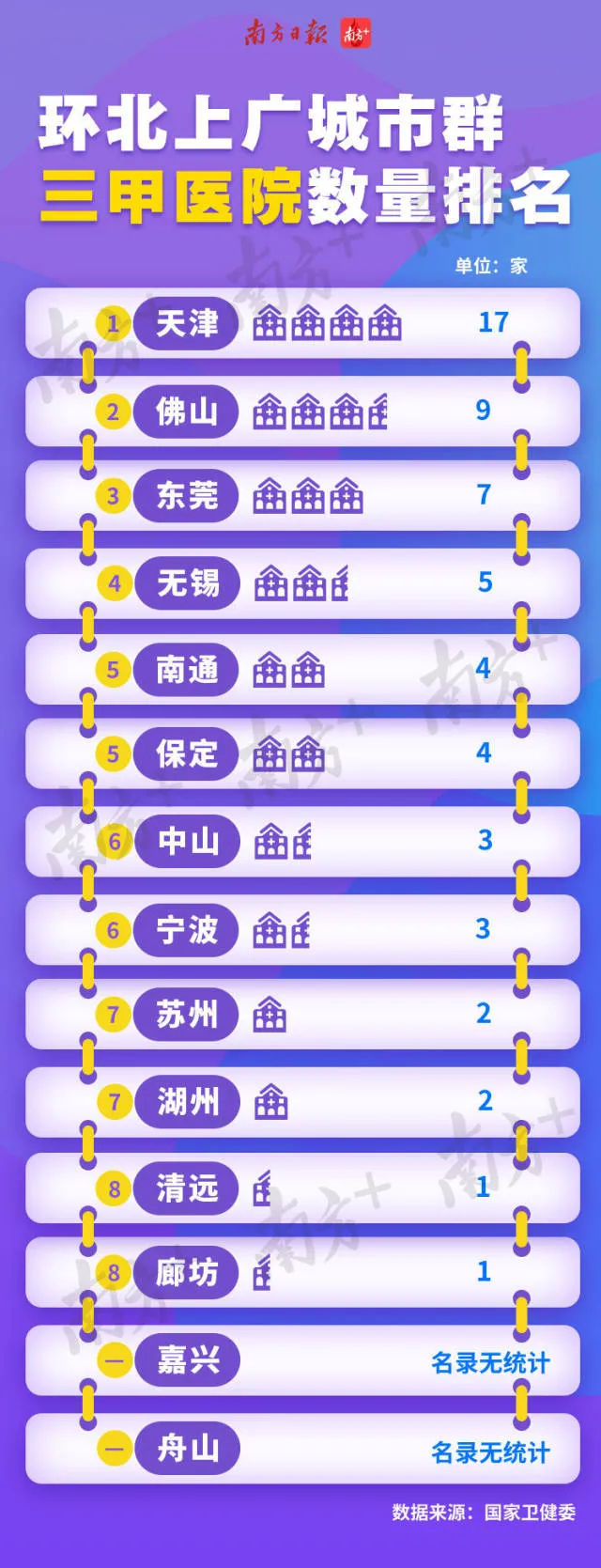 從統(tǒng)計表中可以看到,天津三甲醫(yī)院數(shù)量一騎絕塵。而廣東的佛山、東莞三甲醫(yī)院數(shù)量也不少,醫(yī)療實力值得重視。中山名列第六,在國家衛(wèi)健委名錄中甚至高于蘇州。