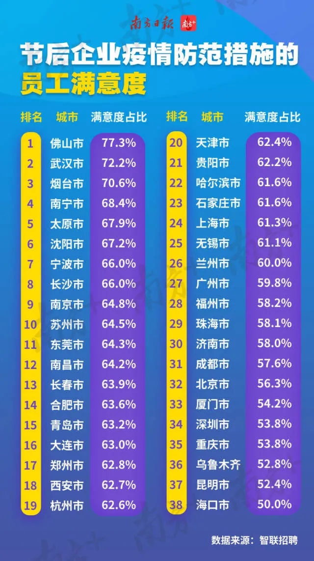 從上述《報告》中可以看出,佛山市企業(yè)的員工滿意度是全國最高的,高達77.3%,與全城“停擺”的武漢、山東煙臺齊齊超過七成滿意度。