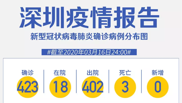截至3月16日24時,深圳累計報告“新冠肺炎”病例423例。3月16日當(dāng)天無新增,出院1例。