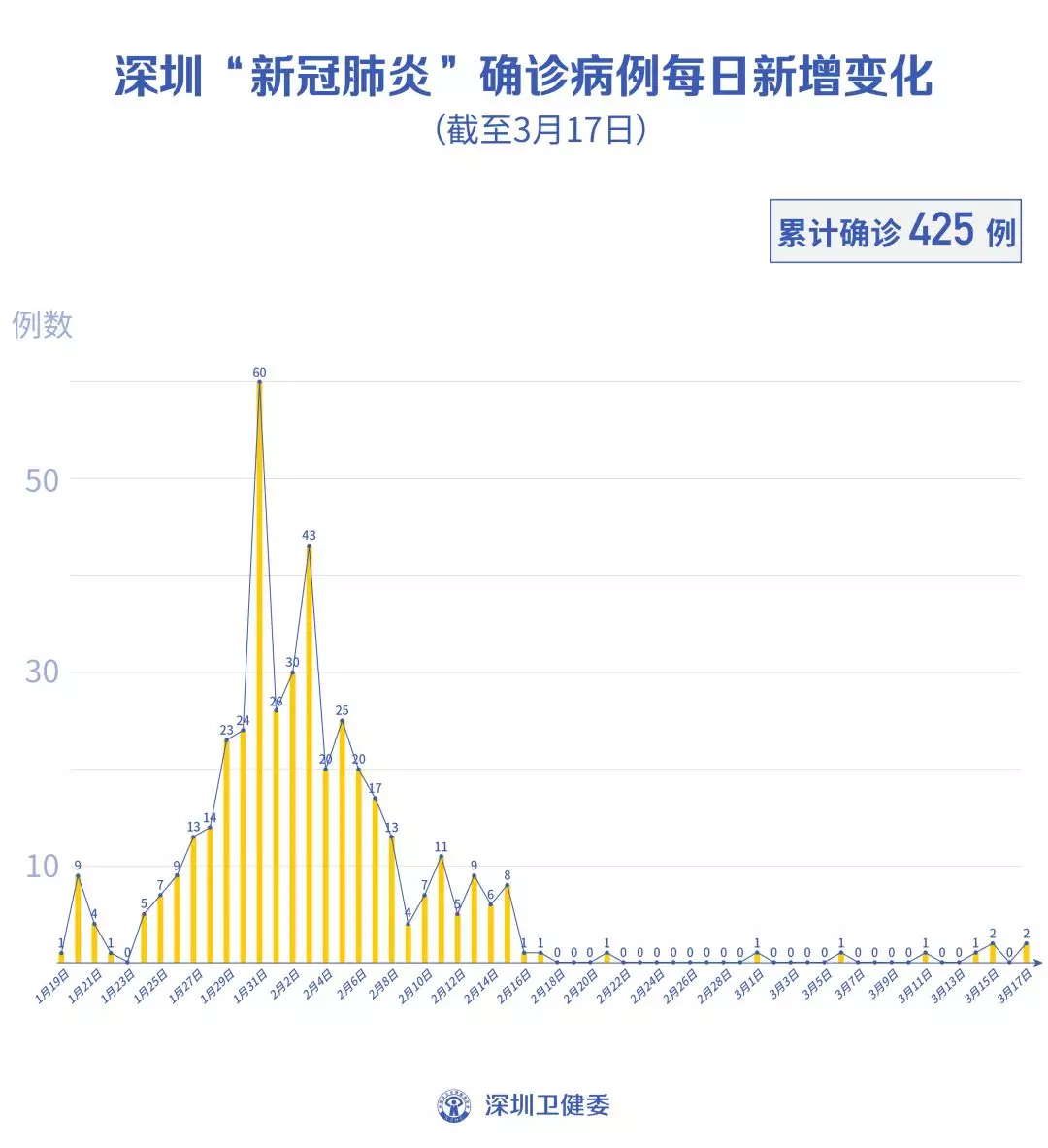 截至3月17日24時,深圳累計報告“新冠肺炎”病例425例。3月17日當天新增2例,出院1例。