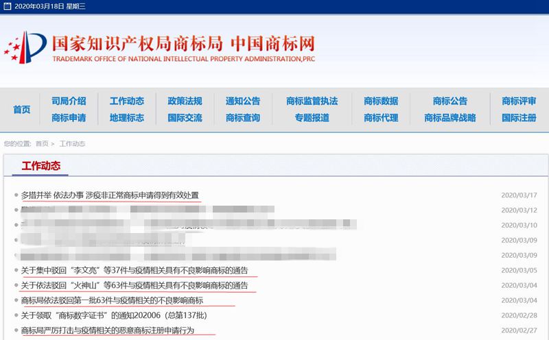 從2月27日到3月17日,商標局工作動態(tài)有5條和涉疫非正常商標申請有關(劃紅線處)