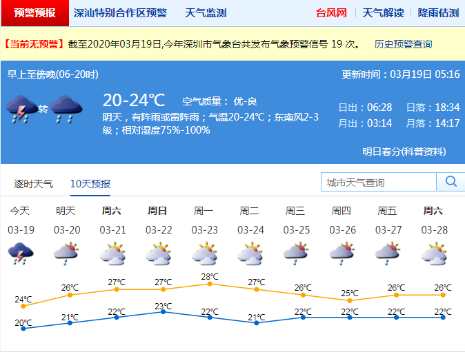 當(dāng)前,深圳已進(jìn)入強(qiáng)對(duì)流天氣多發(fā)季節(jié)。未來幾日天氣是否平穩(wěn)?據(jù)市氣象臺(tái)預(yù)測,19日深圳有雷陣雨,局部大雨,氣溫20℃至24℃;20日陣雨轉(zhuǎn)多云;21日至24日濕度加大,氣溫逐日回升,天氣轉(zhuǎn)熱,早晚有輕霧或霧。